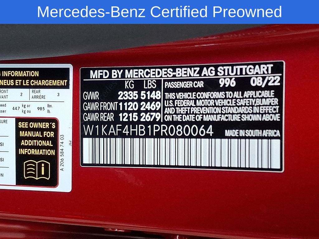 4MATIC®, 11.9" Center Touchscreen Display, 18" 5-Spoke Wheels, 4-way Power Driver's Lumbar Support, 4-Wheel Disc Brakes, 5 Speakers, ABS brakes, Air Conditioning, Alloy wheels, AM/FM radio, AMG® Body Styling, AMG® Floor Mats, AMG® Line Exterior, AMG® Line w/Night Package, Anti-whiplash front head restraints, Apple CarPlay®/Android Auto®, Auto High-beam Headlights, Auto tilt-away steering wheel, Auto-dimming door mirrors, Auto-dimming Rear-View mirror, Automatic temperature control, Black Fabric Headliner, Black Spoiler, Brake assist, Brushed Aluminum Sport Pedals w/Rubber Studs, Bumpers: body-color, Child-Seat-Sensing Airbag, Compass, Delay-off headlights, Digital Light Headlamps, DIGITAL LIGHT Package, Driver door bin, Driver vanity mirror, Dual front impact airbags, Dual front side impact airbags, Electronic Stability Control, Emergency communication system: Mercedes-Benz Emergency Call Service, Exterior Parking Camera Rear, First Aid Kit, Flat-Bottom Sport Steering Wheel, Four wheel independent suspension, Front anti-roll bar, Front Bucket Seats, Front Center Armrest, Front dual zone A/C, Front reading lights, Fully automatic headlights, Garage door transmitter: HomeLink, Genuine wood dashboard insert, GUARD 360, Head restraints memory, Heated door mirrors, Heated front seats, Heated Steering Wheel, Illuminated entry, Knee airbag, Low tire pressure warning, MB Navigation, MB-Tex Dashboard, MB-Tex Upholstery, Memory seat, Metal Weave Center Console, Occupant sensing airbag, Outside temperature display, Overhead airbag, Overhead console, Panic alarm, Panorama Sunroof, Passenger door bin, Passenger vanity mirror, Perforated Brake Discs, Power adjustable front head restraints, Power door mirrors, Power driver seat, Power Heated Front Seats w/Memory, Power moonroof, Power passenger seat, Power steering, Power windows, Premium audio system: MBUX, Premium Trim Package, Radio data system, Radio: FrontBass 5-Speaker Audio System, Rain sensing wipers, Rear anti-roll bar, Rear fog lights, Rear reading lights, Rear seat center armrest, Rear window defroster, Remote keyless entry, Security system, SiriusXM Satellite Radio, Speed control, Speed-sensing steering, Split folding rear seat, Sport Suspension w/Sport Steering System, Star Grille, Steering wheel memory, Steering wheel mounted audio controls, Tachometer, Telescoping steering wheel, Tilt steering wheel, Traction control, Trip computer, Turn signal indicator mirrors, Variably intermittent wipers, Weather band radio, Wheels: 18" AMG® 5-Spoke w/Black Accents, 4MATIC®.