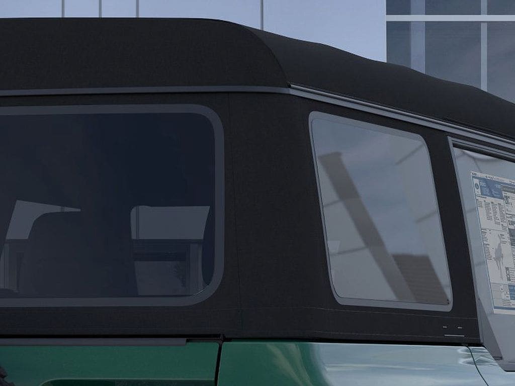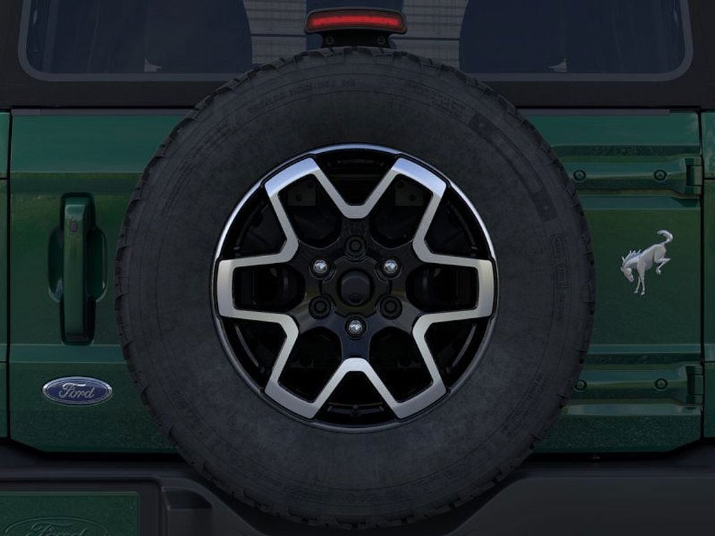 Inside, the Bronco offers heated leather-trimmed and vinyl bucket seats, dual-zone automatic climate control, front center armrest, and ambient Information on Demand panel. Tech amenities include SYNC 4 with Connected Navigation, 360-degree camera, SiriusXM 360L, B&O Sound System, universal garage door opener, and front & rear floor liners.