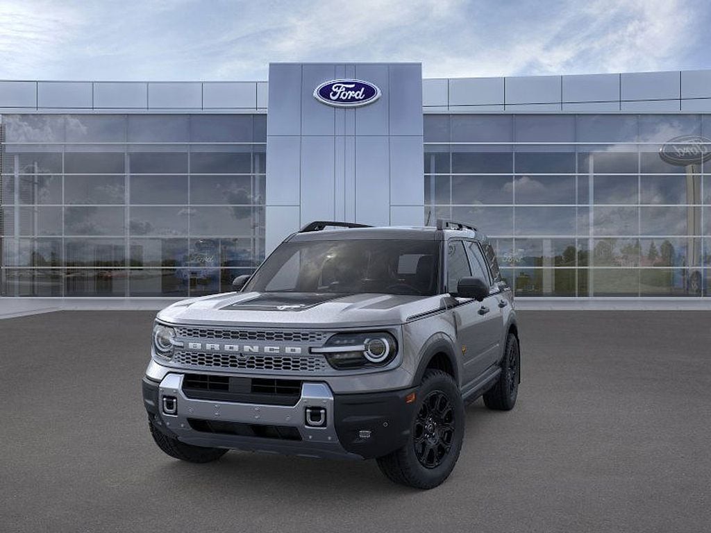 Gray 2025 Ford Bronco Sport Badlands 4WD 8-Speed Automatic EcoBoost 2.0L I4 GTDi DOHC Turbocharged VCT 4-Wheel Disc Brakes, 6 Speakers, ABS brakes, Air Conditioning, Alloy wheels, AM/FM radio: SiriusXM, AM/FM Stereo, Auto High-beam Headlights, Auto-dimming Rear-View mirror, Automatic temperature control, B&O Sound System by Bang & Olufsen, Badlands Tech Package, Brake assist, Cargo Mat, Compass, Connected Navigation, Delay-off headlights, Driver door bin, Driver vanity mirror, Dual front impact airbags, Dual front side impact airbags, Electronic Stability Control, Emergency communication system: SYNC 4 911 Assist, Equipment Group 400A, Four wheel independent suspension, Front & Rear Floor Liners w/o Carpet Mats, Front & Rear Splash Guards, Front anti-roll bar, Front Bucket Seats, Front Center Armrest, Front fog lights, Front License Plate Bracket, Front reading lights, Fully automatic headlights, Garage door transmitter, HD Radio, Heated door mirrors, Heated front seats, Heated steering wheel, Illuminated entry, Knee airbag, Leather Trimmed Front Bucket Seats, Low tire pressure warning, Memory seat, Occupant sensing airbag, Outside temperature display, Overhead airbag, Overhead console, Panic alarm, Passenger door bin, Passenger vanity mirror, Power door mirrors, Power driver seat, Power Moonroof, Power passenger seat, Power steering, Power windows, Radio data system, Rear anti-roll bar, Rear reading lights, Rear seat center armrest, Rear window defroster, Rear window wiper, Remote keyless entry, Security system, SiriusXM, Speed control, Speed-sensing steering, Speed-Sensitive Wipers, Split folding rear seat, Steering wheel mounted audio controls, SYNC 4 w/Enhanced Voice Recognition, Tachometer, Telescoping steering wheel, Tilt steering wheel, Topo Graphic Package, Traction control, Trip computer, Variably intermittent wipers, Wheels: 17" Matte Black-Painted Aluminum.