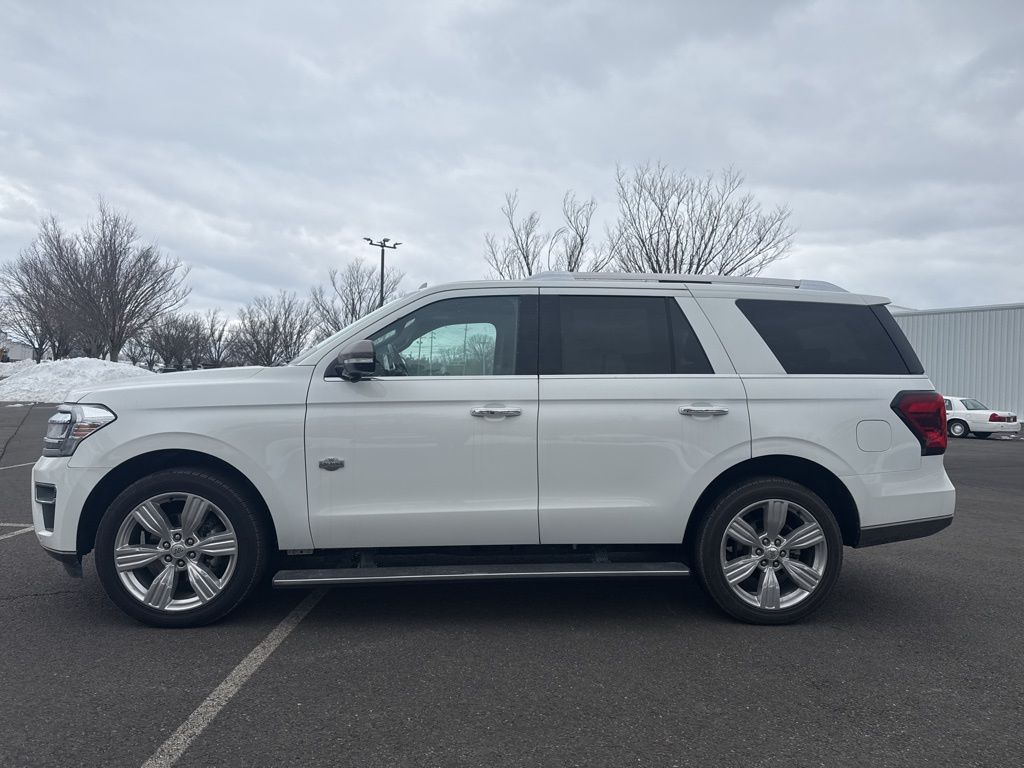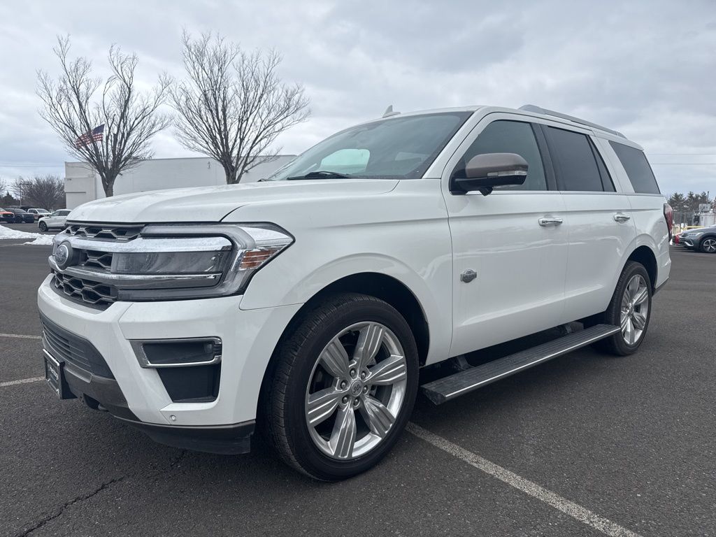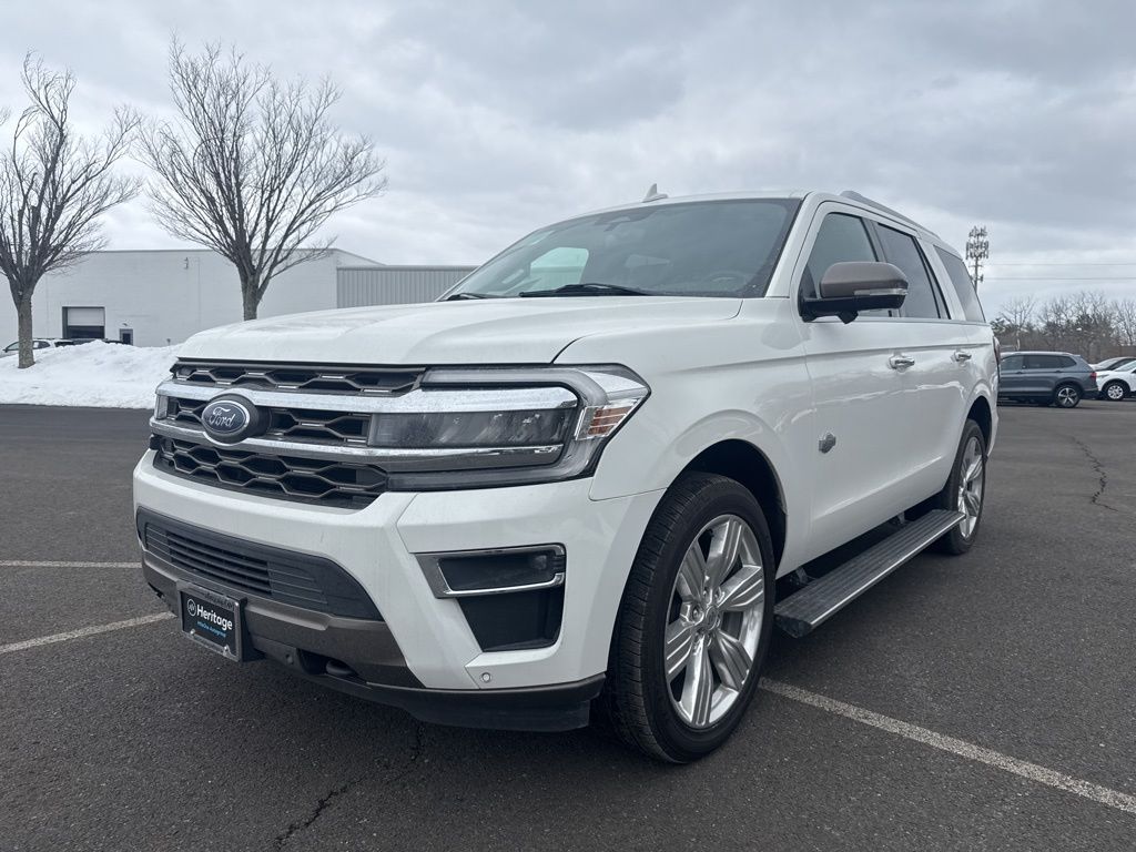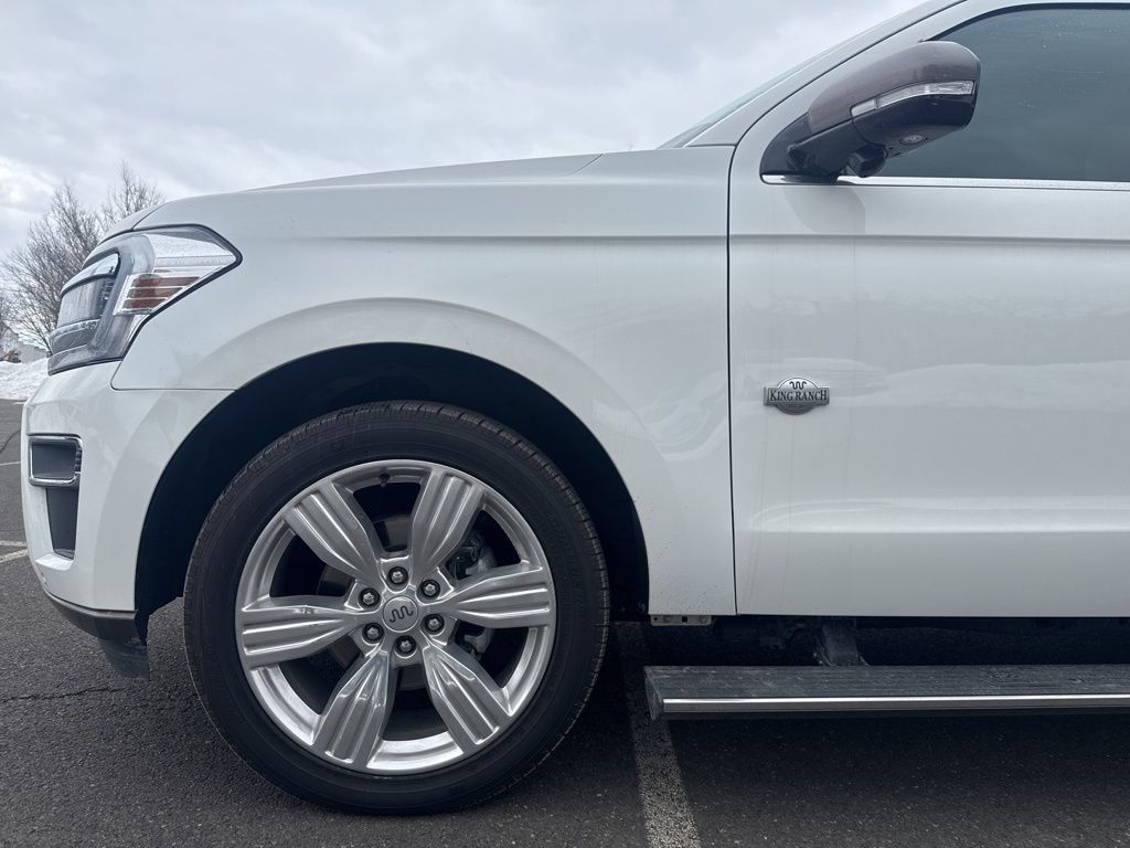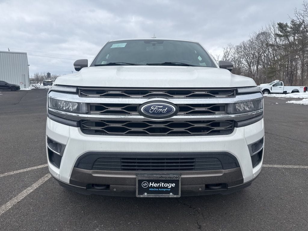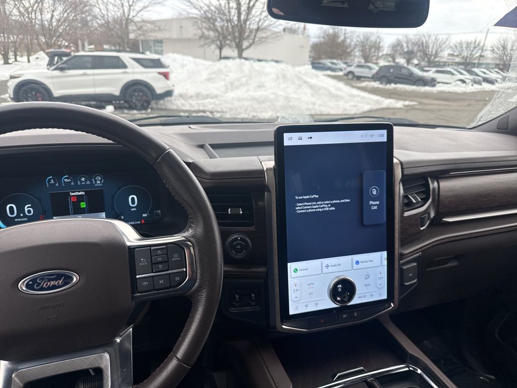 4WD, 1st & 2nd Row Floor Liners w/Carpet Mats, 22 Speakers, 360-Degree Camera w/Trailer Reverse Guidance, 3rd row seats: split-bench, 4-Wheel Disc Brakes, ABS brakes, Adaptive suspension, Adjustable pedals, Air Conditioning, Alloy wheels, AM/FM radio: SiriusXM with 360L, Auto High-beam Headlights, Auto Start-Stop Removal, Auto-dimming door mirrors, Auto-dimming Rear-View mirror, Automatic temperature control, Brake assist, Bumpers: body-color, Compass, Continuous Controlled Damping (CCD), Delay-off headlights, Driver door bin, Driver vanity mirror, Dual front impact airbags, Dual front side impact airbags, Electronic Stability Control, Emergency communication system: SYNC 4 911 Assist, Equipment Group 400A Standard Package, Exterior Parking Camera Rear, Four wheel independent suspension, Front anti-roll bar, Front Bucket Seats, Front Center Armrest, Front dual zone A/C, Front fog lights, Front reading lights, Fully automatic headlights, Garage door transmitter, Genuine wood console insert, Genuine wood dashboard insert, Genuine wood door panel insert, Heated door mirrors, Heated front seats, Heated rear seats, Heated steering wheel, Heated/Ventilated Del Rio Lthr Fr Captain's Chairs, Heavy-Duty Trailer Tow Package, Illuminated entry, Integrated Trailer Brake Controller, Leather steering wheel, Low tire pressure warning, Memory seat, Navigation system: Connected Navigation, Occupant sensing airbag, Outside temperature display, Overhead airbag, Overhead console, Panic alarm, Passenger door bin, Passenger vanity mirror, Pedal memory, Power door mirrors, Power driver seat, Power Liftgate, Power moonroof, Power passenger seat, Power steering, Power windows, Pro Trailer Backup Assist, Radio data system, Radio: B&O Unleashed Sound System by Bang & Olufsen, Rain sensing wipers, Rear air conditioning, Rear anti-roll bar, Rear reading lights, Rear window defroster, Rear window wiper, Reclining 3rd row seat, Remote keyless entry, Reversible Cargo Mat, Security system, SiriusXM w/360L, Speed control, Speed-sensing steering, Speed-Sensitive Wipers, Split folding rear seat, Spoiler, Steering wheel memory, Steering wheel mounted audio controls, SYNC 4 w/Enhanced Voice Recognition, Tachometer, Telescoping steering wheel, Tilt steering wheel, Traction control, Trip computer, Turn signal indicator mirrors, Variably intermittent wipers, Ventilated front seats, Voltmeter, Wheels: 22" 6-Spoke Polished Aluminum, 4WD.