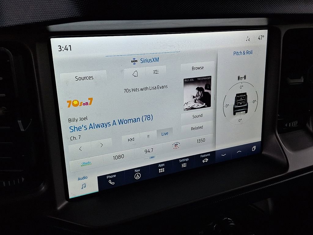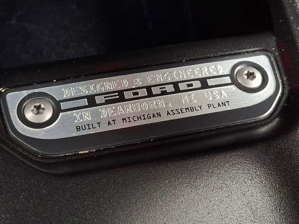 10 Speakers w/Subwoofer, 12 LCD Capacitive Touchscreen w/Swipe Capability, 18 Bright Machined Aluminum Wheels, 2 Smart Charging USB Ports In Dashboard, 360-Degree Camera, 4-Wheel Disc Brakes, 7 Speakers, ABS brakes, Adaptive Cruise Control, Additional Sound Deadening, Air Conditioning, Alloy wheels, AM/FM radio: SiriusXM with 360L, AM/FM Stereo, Auto High-beam Headlights, Auto-dimming Rear-View mirror, Automatic temperature control, Auxiliary Switches, Brake assist, Compass, Connected Built-In Navigation, Connected Navigation, Delay-off headlights, Driver door bin, Driver vanity mirror, Dual front impact airbags, Dual front side impact airbags, Dual Tops, Electronic Stability Control, Emergency communication system: 911 Assist, Equipment Group 314A Lux Package, Evasive Steering Assist, Exterior Parking Camera Rear, Ford Performance Heavy-Duty Modular Front Bumper, Front anti-roll bar, Front Bucket Seats, Front Center Armrest, Front dual zone A/C, Front fog lights, Front Parking Sensors, Front reading lights, Front wheel independent suspension, Fully automatic headlights, Heated door mirrors, Heated front seats, Heated Leather-Trimmed/Vinyl Bucket Seats, Heated Steering Wheel, High Clearance Fender Flares, High Clearance Suspension, Illuminated entry, Information on Demand Panel, Integrated roll-over protection, Leather Shift Knob, Low tire pressure warning, Navigation system: Connected Navigation, Occupant sensing airbag, Outside temperature display, Overhead airbag, Overhead console, Panic alarm, Passenger door bin, Passenger vanity mirror, Position-Sensitive Bilstein Shock Absorbers, Power door mirrors, Power steering, Power windows, Radio data system, Radio: B&O Sound System by Bang & Olufsen, Remote keyless entry, Sasquatch Package, Security system, Sideview Mirrors, SiriusXM Radio w/360L, Speed control, Split folding rear seat, Steering wheel mounted audio controls, SYNC 4, Tachometer, Telescoping steering wheel, Tilt steering wheel, Traction control, Trip computer, Universal Garage Door Opener, Variably intermittent wipers, Voltmeter, Wheels: 17 Black High Gloss-Painted Aluminum, Wireless Charging Pad.