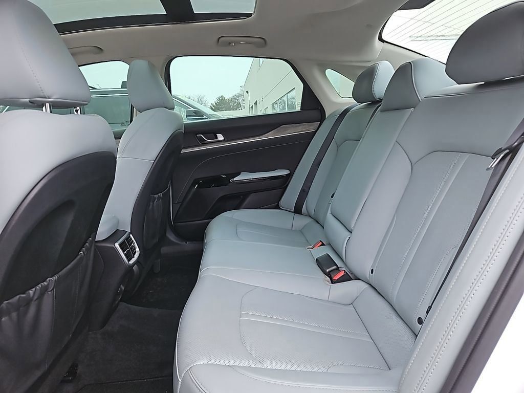 Beneath the striking Glacial White Pearl exterior, the K5 EX houses a 1.6L I4 DGI engine mated to an 8-speed automatic transmission, delivering an impressive 27 city and 37 highway MPG. This powertrain not only provides responsive acceleration but also exceptional fuel efficiency, allowing you to enjoy the journey without frequent stops at the pump.